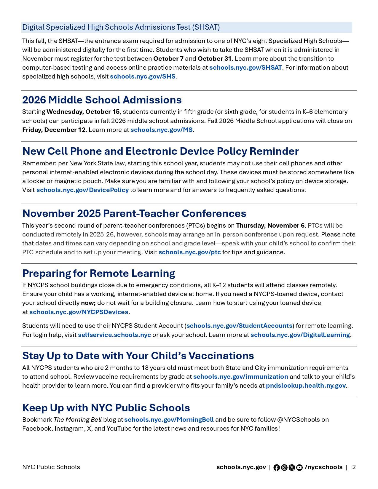 October New York City Public Schools Update https://www.schools.nyc.gov/about-us/messages-for-families Source: New York City Public Schools